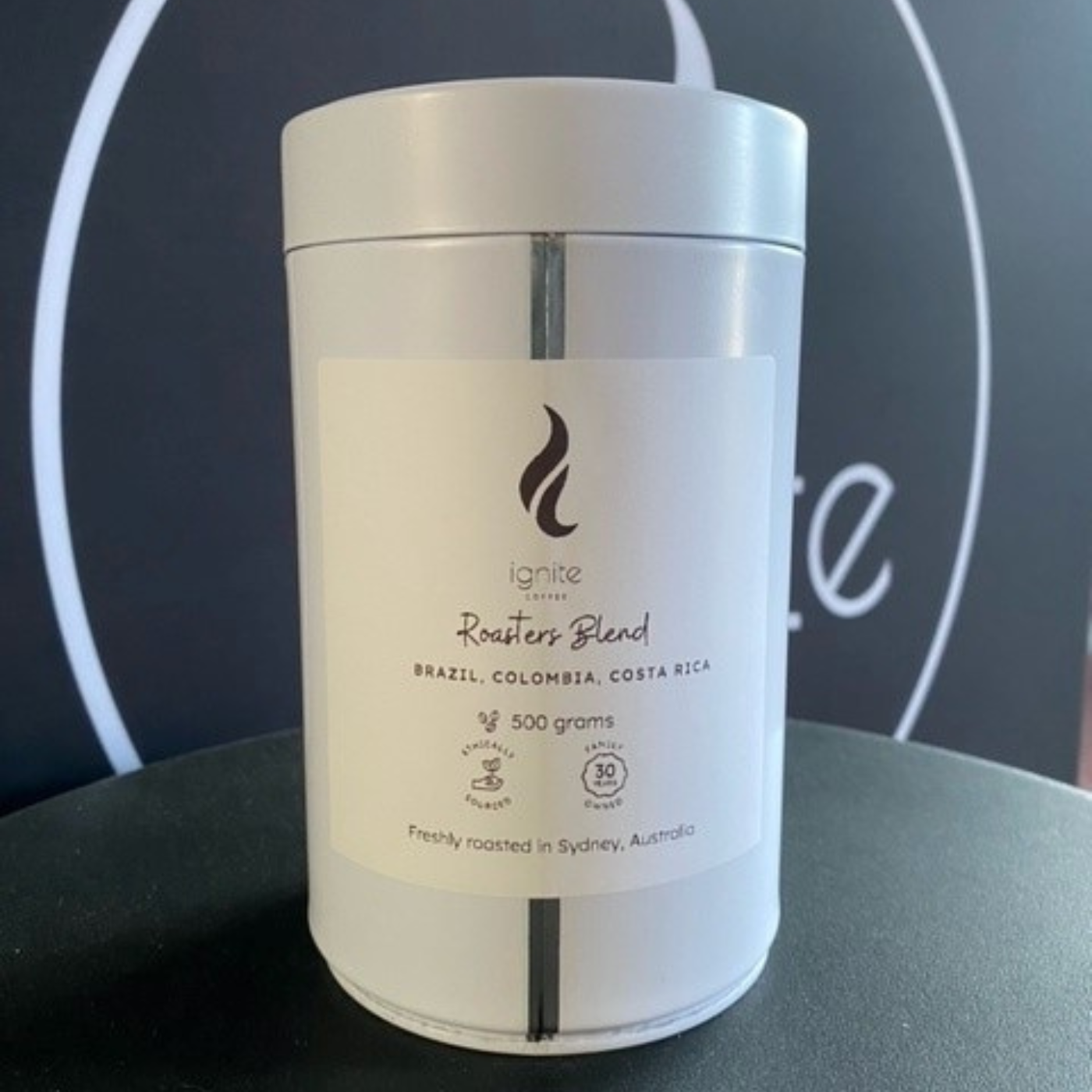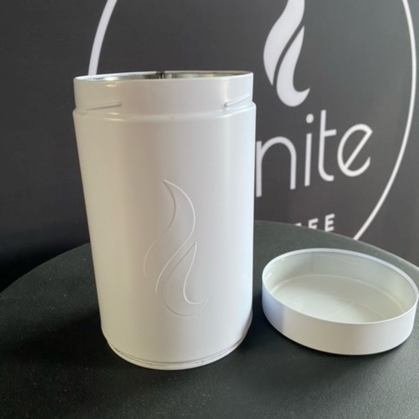 Coffee of the month is packed in our food grade storage tin with screw top lid and degassing valve.